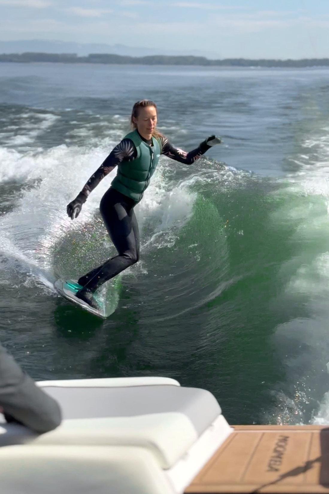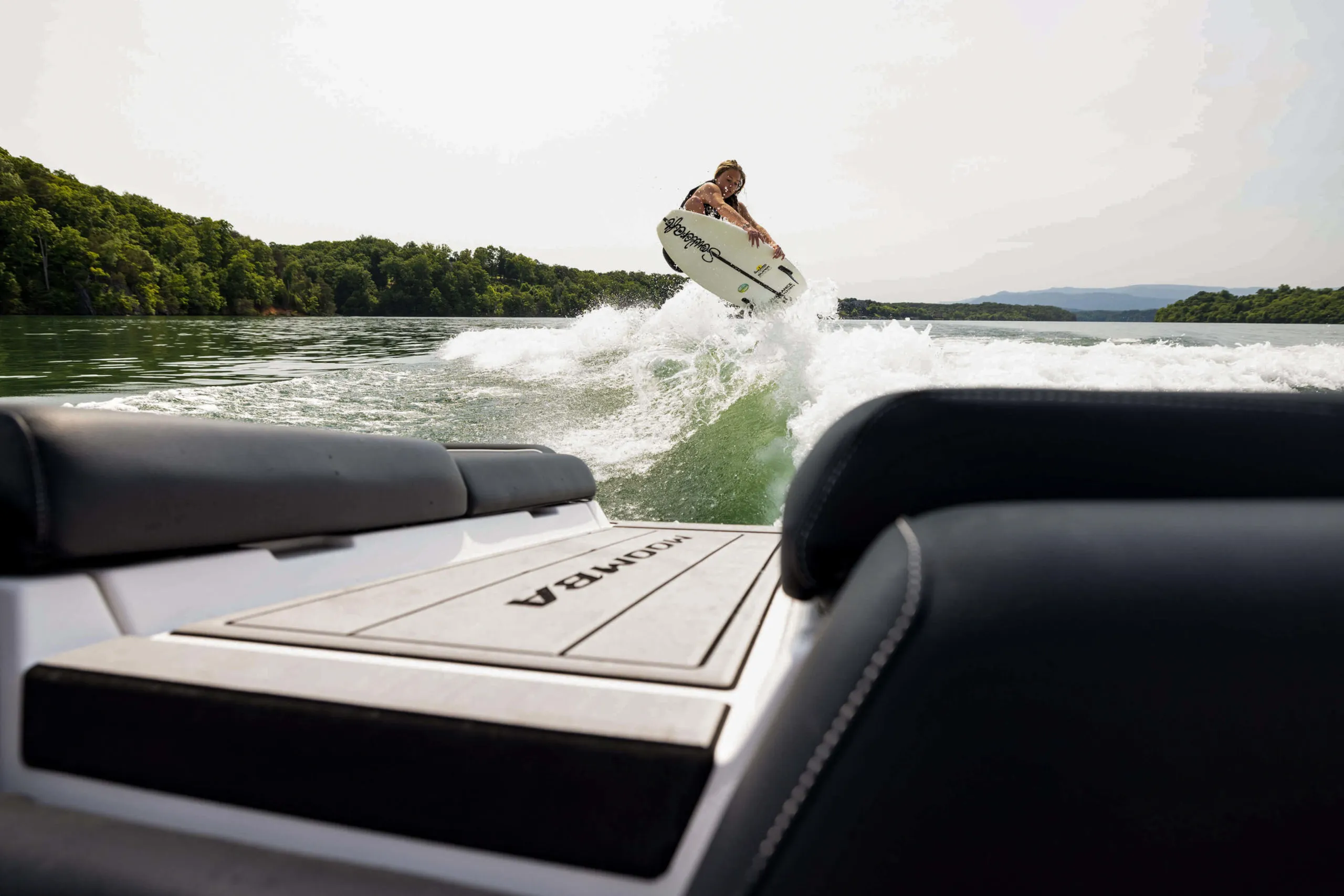 Mit dem Moomba Mojo 2023 bieten wir unseren Gästen eine perfekte Welle für’s Wakeborden und Wakesurfen. Das Rumpfdesign vom Moomba Mojo in Kombination mit dem AutoWake Surf System und einem Grundballast von 1815 kg erzeugt eine grosse cleane Welle und schreit danach, in Action erlebt zu werden.